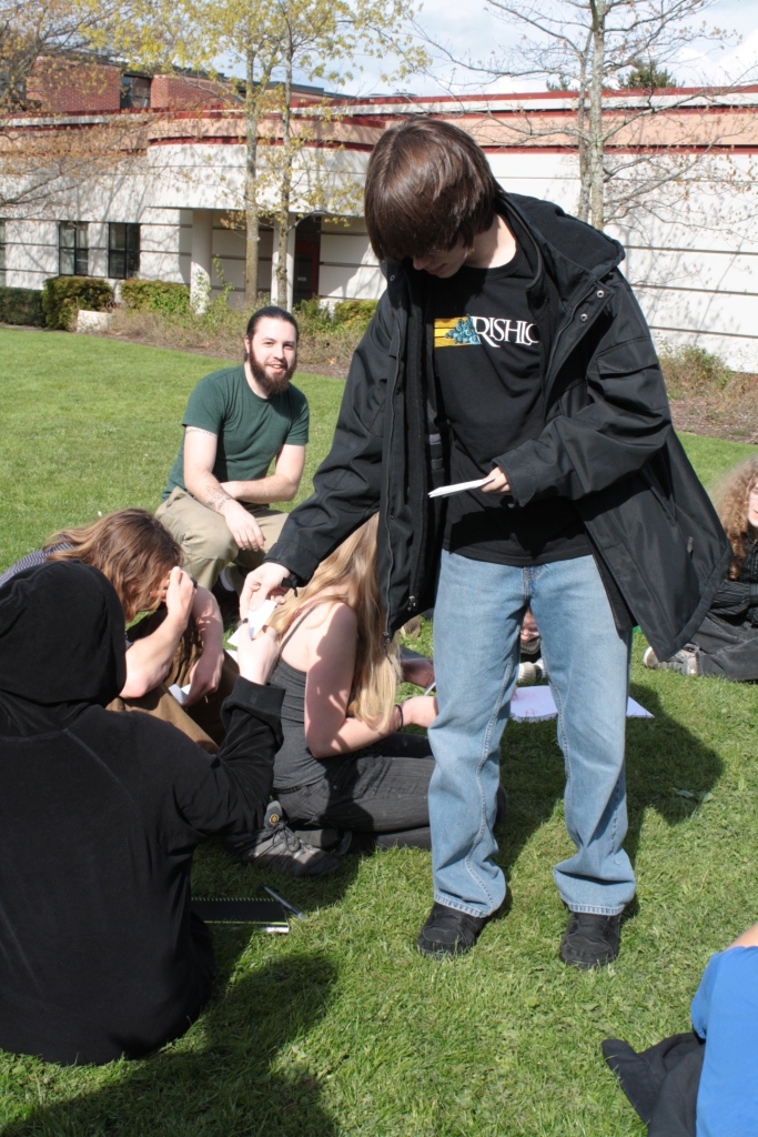 With the room they had planned on meeting in unexpectedly occupied, the Skeptic Society moved their second meeting to the lawn outside Syre to make use of the sunny but brisk spring day.