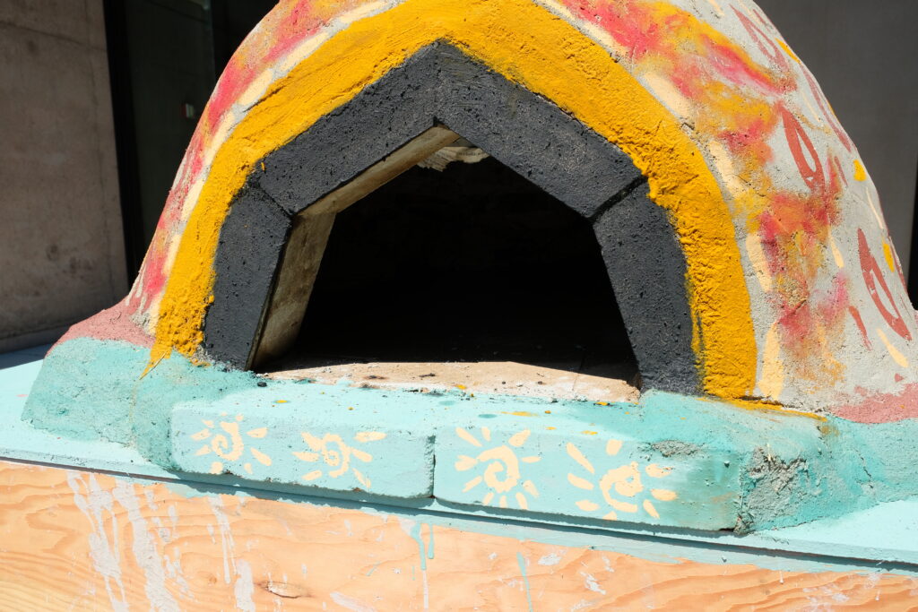 The finished cob oven was painted in some naturally made colors such as iron oxide for red and turmeric for yellow at Roe Studios Whatcom Community College.
