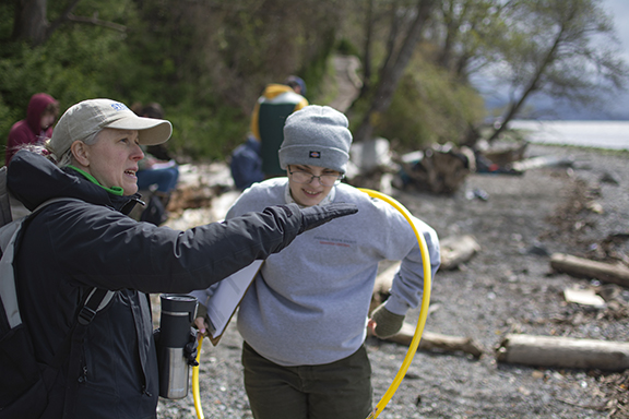 WWU and WCC students gather around WWU Professor, Mira Lutz, who is providing instructions for clam surveying. Photo curtesy of Ian Stacy.