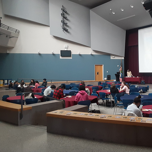 The trivia playing began around 4:20, once more students had sat down with their punch and plates of tortellini and salad. Two Kahoots were projected against the screen at the stage, allowing every attendee the opportunity to shoot their shot at animal trivia and food and drink trivia. First, second, and third place winners had their choice of Orca-themed prizes, including ASWCC tote bags, stress balls, and stickers!